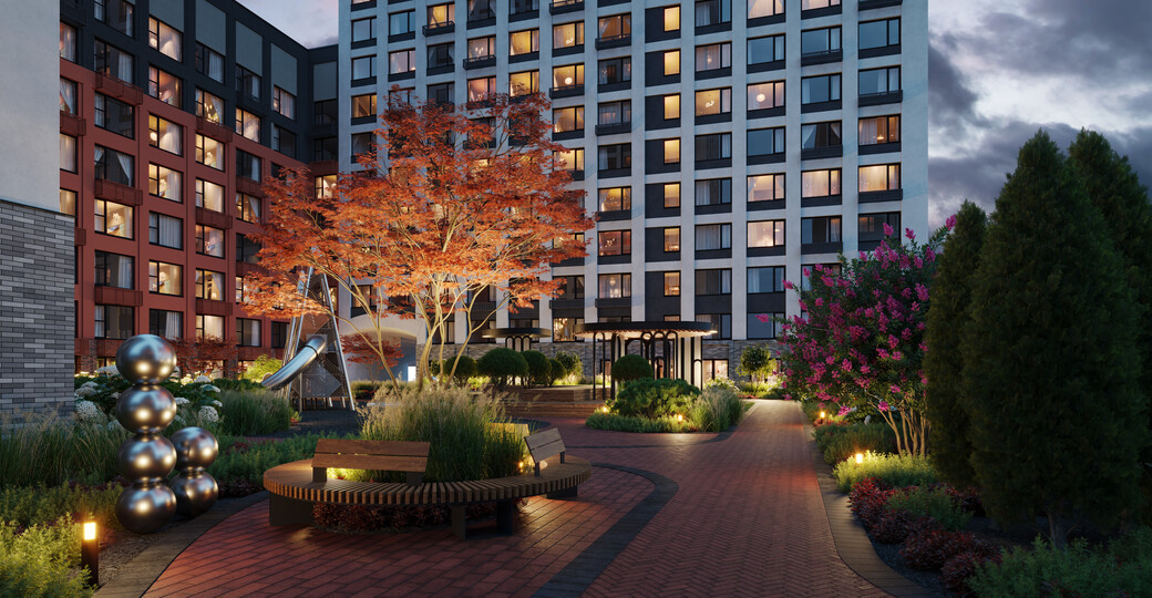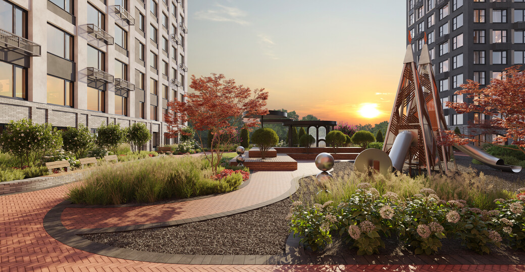Закрытый двор в «Мармакс. Проспект Ленина» — ландшафтный сад с детскими площадками из натуральных материалов и зонами отдыха. Здесь уютно и светло за счет переменной этажности секций, а в жаркий день всегда можно укрыться в тени деревьев.